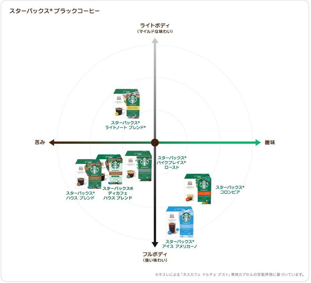ブラック系・ラテ系・スターバックスシリーズなど、味・強さ・甘さの違いが一目で分かるよう徹底的に整理しました。
